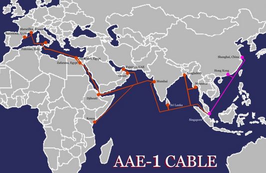 AAE-1海底光纜系統(tǒng)將連接阿聯(lián)酋,香港,越南,馬來西亞,新加坡,泰國,印度,巴基斯坦,阿曼,卡塔爾,也門,吉布提,沙特阿拉伯,埃及,希臘,意大利和法國,全長約25000千米,設計容量為40 terabits(兆兆位),由全球17家電信公司聯(lián)合投資建設,印度段則由Reliance Jio Infocomm負責承建。