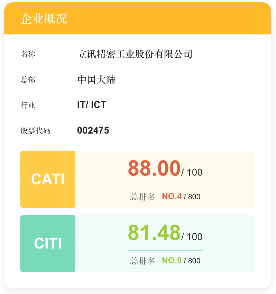ICC訊 2025年11月6日,公眾環(huán)境研究中心(IPE)在北京舉辦2025年綠色供應(yīng)鏈暨企業(yè)氣候行動(dòng)論壇。立訊精密獲邀參會(huì),會(huì)上發(fā)布了綠色供應(yīng)鏈指數(shù)(CITI)和企業(yè)氣候行動(dòng)指數(shù)(CATI)評(píng)價(jià)結(jié)果。本次評(píng)價(jià)覆蓋23個(gè)行業(yè)的800家中外企業(yè),立訊精密CITI及CATI指數(shù)排名均闖入行業(yè)前三,總排名雙雙邁進(jìn)前10,表現(xiàn)領(lǐng)跑大中華區(qū)。