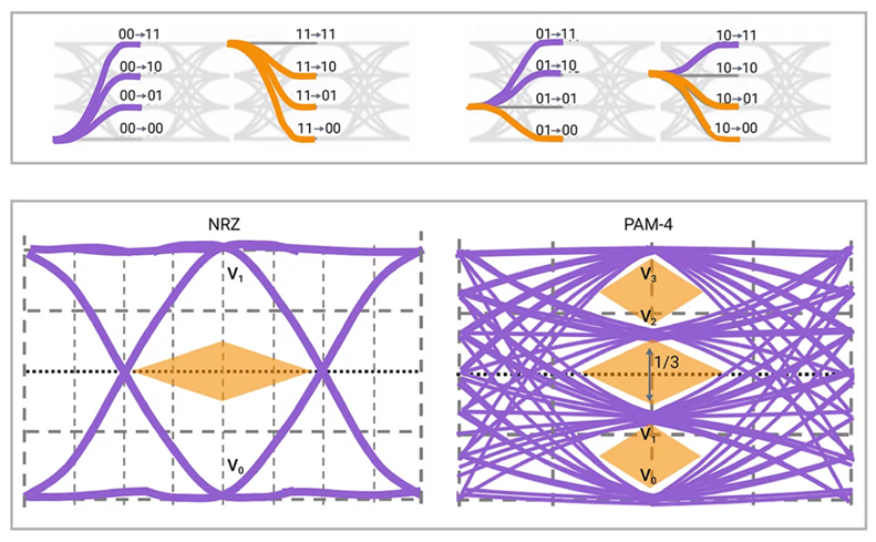 NRZ 與 PAM4 的主要區(qū)別之一在于其信號對噪聲的易感性。PAM4 使用四個電壓級來傳輸數(shù)據(jù),這使得相鄰電壓級之間的間隔變小,導致每個電壓級更容易受到噪聲的干擾。當數(shù)據(jù)速率增加時,PAM4 信號的眼圖變得更加擠壓,增加了符號間干擾(ISI)的風險。NRZ 信號相對來說具有更寬的電壓間隔,因此在相同的信號條件下,其抗噪能力較強。這也是 NRZ 信號在低速應用中表現(xiàn)良好的原因。在進行信號分析時,眼圖(Eye Diagram)是常見的工具,用來可視化數(shù)據(jù)的穩(wěn)定性和符號間干擾。PAM4 信號的眼圖相對 NRZ 更為復雜,因為它有四個電壓級,這會產(chǎn)生多個“眼睛”。由于每個“眼睛”表示不同的符號間隔,當信號受到噪聲或抖動時,這些眼睛會迅速關閉,導致錯誤率增加。PAM4 的眼圖會產(chǎn)生三個不同的“眼睛”,其間距比 NRZ 小得多,因此需要更高的信號處理能力來確保穩(wěn)定傳輸。綜合上述討論,PAM4 技術的引入使得數(shù)據(jù)速率成倍增加,但同時也帶來了諸多技術挑戰(zhàn):