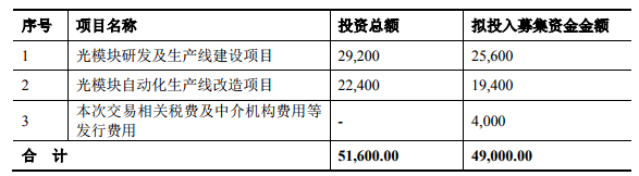 具體來看,新項目包括2項,一是光模塊研發(fā)及生產(chǎn)線建設(shè),投資總額達2.92億元,擬投入募集資金為2.56億元;二是光模塊自動化生產(chǎn)線改造,總投資2.24億元,擬投入募集資金1.94億元。