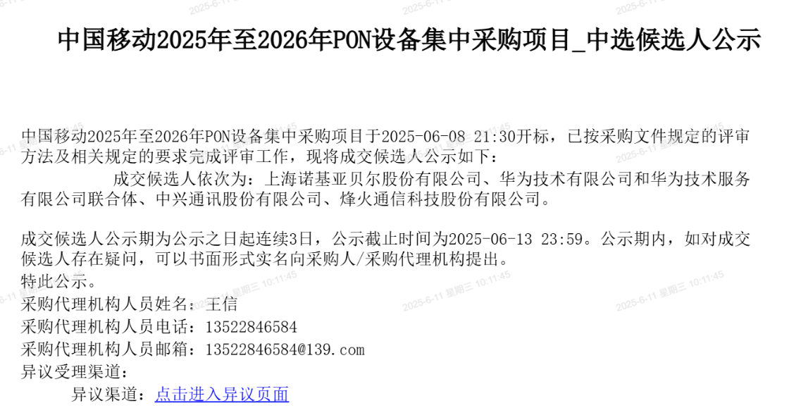 ICC訊 2025年6月11日,中國移動(dòng)于采購網(wǎng)發(fā)布了《2025年至2026年P(guān)ON設(shè)備集中采購項(xiàng)目中選候選人公示》。本次采購規(guī)模為:PON端口約265.6萬個(gè),子框7857端,MDU設(shè)備55.4萬端,集中化網(wǎng)管系統(tǒng)15套,智能板卡1742塊,采用在網(wǎng)設(shè)備擴(kuò)容方式建設(shè)。