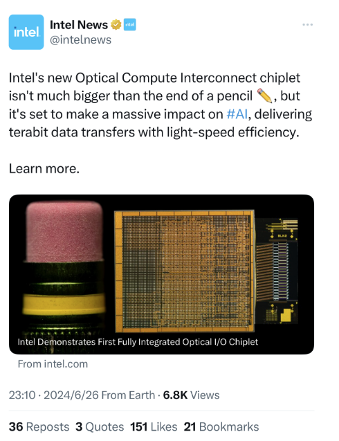 ICC訊 英特爾的OCI(光學(xué)計算互連)芯粒有望革新面向AI基礎(chǔ)設(shè)施的高速數(shù)據(jù)處理。