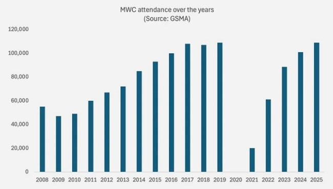 ICC  (原文作者:Iain Morris,Light Reading國際編輯)根據(jù)活動主辦方全球移動通信系統(tǒng)協(xié)會(GSMA)的數(shù)據(jù),2025年的巴塞羅那世界移動通信大會(MWC)約有10.9萬名參會者。