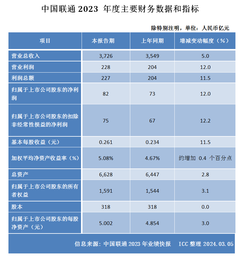 ICC 今日,中國(guó)聯(lián)通公示了公司2023 年度業(yè)績(jī)快報(bào)。