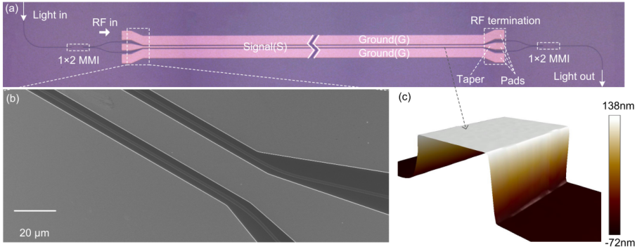 圖1 (a)鈮酸鋰薄膜電光調制器結構圖 (b)波導和行波電極的掃描電鏡照片 (c)波導的原子力顯微鏡測試圖