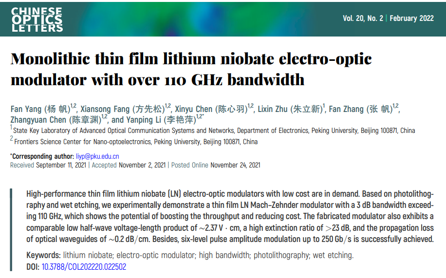 因此《》如何在保證器件卓越性能的同時降低制造成本成為亟待解決的問題。北京大學的李艷萍副教授課題組在 Chinese Optics Letters ,第20卷第2期(Fan Yang, et al., Monolithic thin film lithium niobate electro-optic modulator with over 110 GHz bandwidth)上展示了一種通過晶圓級紫外光刻和濕法蝕刻制造的具有110 GHz以上帶寬的鈮酸鋰薄膜電光調制器,并被選為當期Editors’ Pick。鈮酸鋰薄膜電光調制器結構和測試圖見圖1。該器件基于馬赫-增德爾干涉結構,采用濕法刻蝕工藝避免了傳統(tǒng)干法刻蝕工藝中微掩膜和重沉積的影響,并且獲得了傳輸損耗約為0.2 dB/cm的光波導和高質量的行波電極。同時,該器件具有低的半波電壓長度乘積(2.37 Vcm)和高的消光比(>23 dB)。在系統(tǒng)內ADC/DAC帶寬限制的情況下,仍然可以支持高達 250 Gb/s 的 PAM-6 和 200 Gb/s 的 PAM-4 數(shù)據(jù)傳輸。