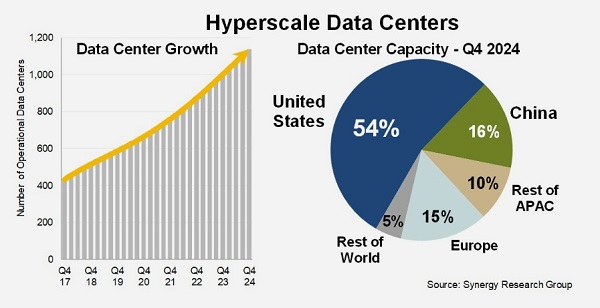 ICC訊 Synergy研究集團的最新數(shù)據顯示,截至2024年底,由超大規(guī)模提供商運營的大型數(shù)據中心數(shù)量已增至1,136個,在過去五年中翻了一番。