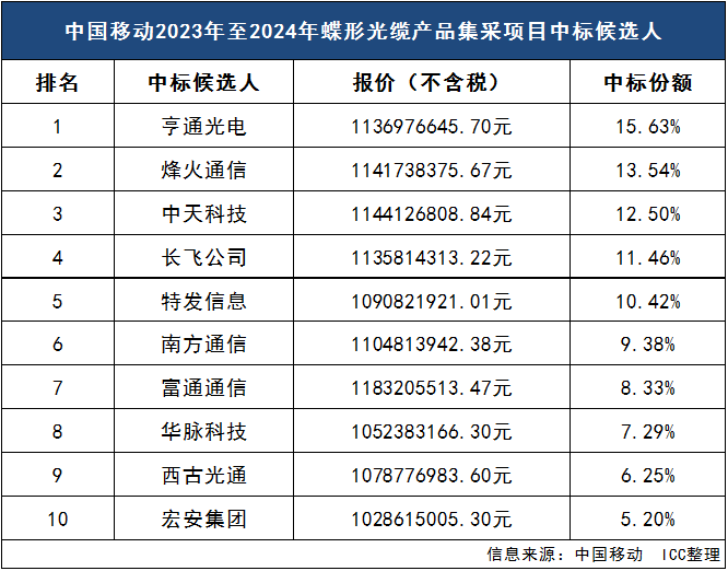 ICC訊 6月6日消息,中國移動發(fā)布2023-2024年蝶形光纜產(chǎn)品集采項目中標(biāo)候選人名單,亨通光電、烽火通信、中天科技、長飛公司、特發(fā)信息、華脈科技等十家企業(yè)成功中標(biāo)入圍,具體排名、份額及報價如下: