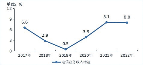 圖1 2017—2022年電信業(yè)務(wù)收入增長情況
