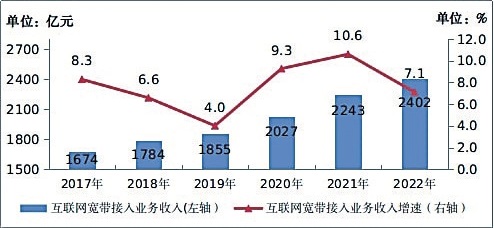 圖2 2017—2022年互聯(lián)網(wǎng)寬帶接入業(yè)務(wù)收入發(fā)展情況