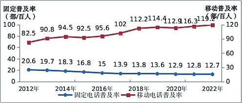 圖5 2012—2022年固定電話及移動電話普及率發(fā)展情況