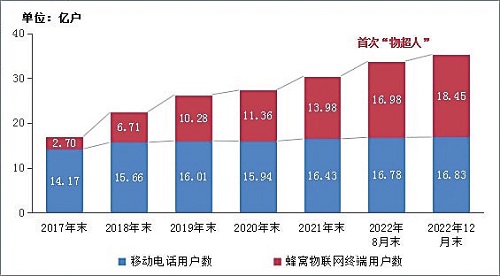 截至2022年底,三家基礎(chǔ)電信企業(yè)發(fā)展蜂窩物聯(lián)網(wǎng)用戶18.45億戶,全年凈增4.47億戶,較移動電話用戶數(shù)高1.61億戶,占移動網(wǎng)終端連接數(shù)(包括移動電話用戶和蜂窩物聯(lián)網(wǎng)終端用戶)的比重達52.3%。