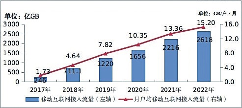 圖7 2017—2022年移動互聯(lián)網(wǎng)流量及月戶均流量(DOU)增長情況