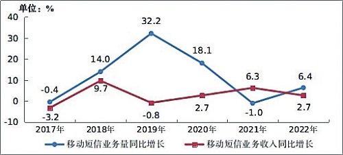 圖8 2017—2022年移動短信業(yè)務(wù)量和收入增長情況