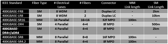 以下是IEEE標準發(fā)布或仍在開發(fā)的所有400G光學PMD(Physical Media Dependent)列表: