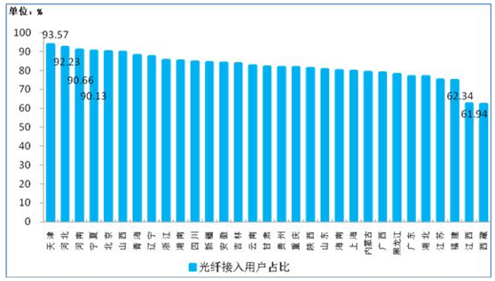 值得注意的是各省間光纖接入用戶占比差異呈縮小態(tài)勢,天津、河北、河南、寧夏和北京分別居全國前四位,占比均超過90%。
