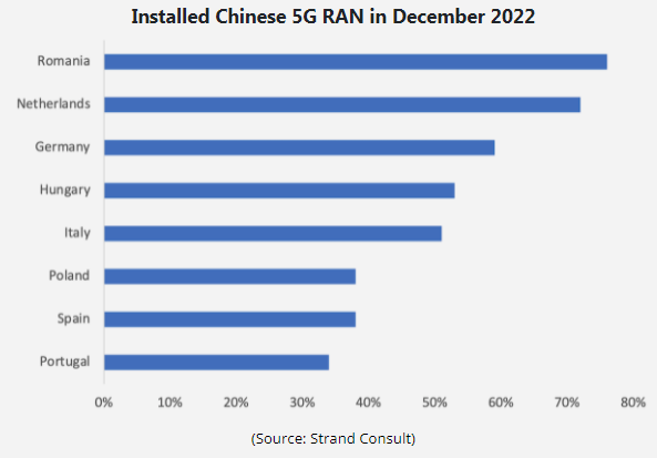 在歐洲,德國也不是什么異類。Strand Consult的報告顯示,該地區(qū)的許多其他國家繼續(xù)從中國供應(yīng)商那里購買產(chǎn)品,主要是華為。僅舉幾例,截至去年年底,他們在匈牙利安裝的5G設(shè)備中所占份額為53%,意大利為51%,荷蘭為72%,波蘭為38%,葡萄牙為34%,羅馬尼亞為76%,西班牙為38%。