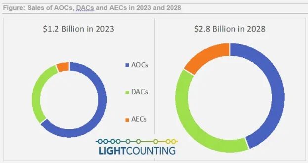 自2023年以來,AI集群大規(guī)模建設推動了高速線纜互連產(chǎn)品需求快速增長,LightCounting在此前發(fā)布的高速線纜/LPO和CPO報告中預測未來五年高速線纜市場規(guī)模將增加一倍以上,到2028年將達到28億美元。有源電纜(AEC)將逐步搶占有源光纜(AOC)和無源直連銅纜(DAC)的市場份額。