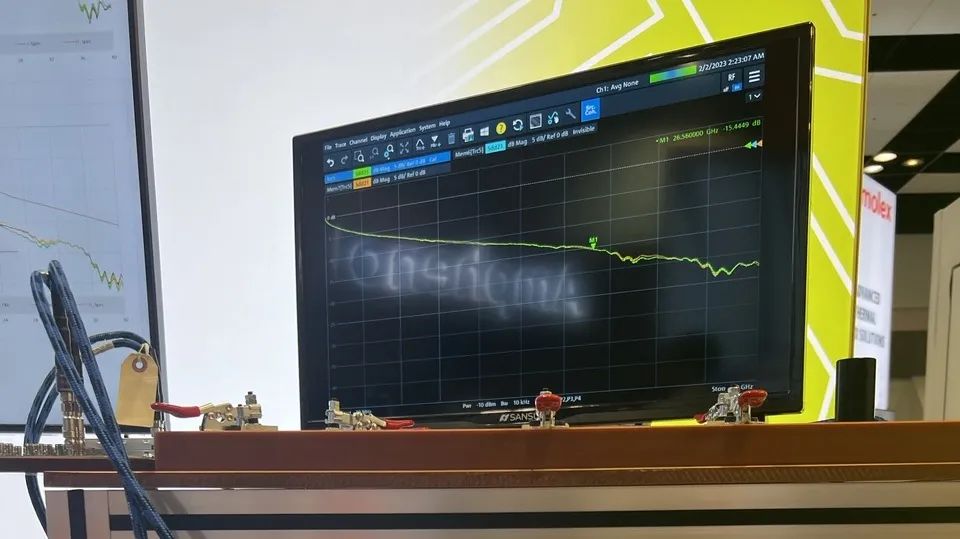 在展會現場,立訊技術(Luxshare-Tech)利用224G測試治具完整演示了頻寬高達70Ghz時,產品平滑的性能衰減;并真實模擬了數據中心安裝過程中,112G Optamax S裸線多次彎折扭轉后的優(yōu)異高頻性能。