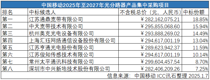 共計(jì)有8家廠商中標(biāo):江蘇通鼎寬帶有限公司、中天寬帶技術(shù)有限公司、杭州奧克光電設(shè)備有限公司、上海匯玨網(wǎng)絡(luò)通信設(shè)備股份有限公司、江蘇亨通光電股份有限公司、江蘇俊知傳感技術(shù)有限公司、常州太平通訊科技有限公司、深圳市中興新地技術(shù)股份有限公司。具體情況如下: