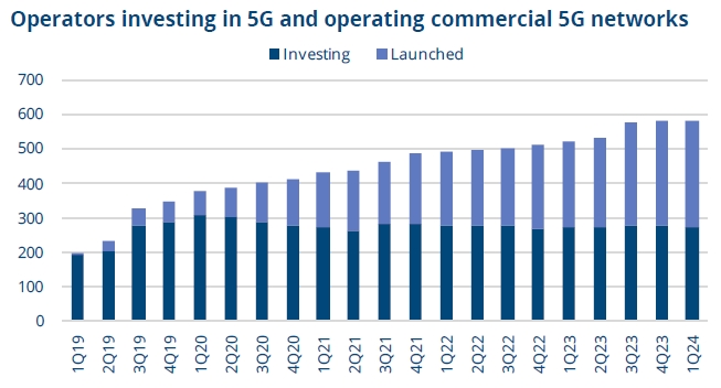 ICC訊(編譯:Nina)根據(jù)GSA(全球移動(dòng)供應(yīng)商協(xié)會(huì))最新統(tǒng)計(jì)數(shù)據(jù),截至2024年3月底,GSA已確定全球有175個(gè)國(guó)家(1月底時(shí)為176家)和地區(qū)的585家運(yùn)營(yíng)商(1月底時(shí)為585家)在投資5G,投資方式包括試驗(yàn)、獲取許可證、規(guī)劃、部署網(wǎng)絡(luò)和商用。這一數(shù)字不包括近200家在美國(guó)拍賣CBRS頻譜時(shí)獲得優(yōu)先接入許可證的公司,這些頻譜可能用于5G。