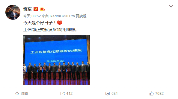小米集團創(chuàng)始人、董事長兼CEO雷軍在微博上祝賀了5G牌照發(fā)放,并表示“今天是個好日子”。