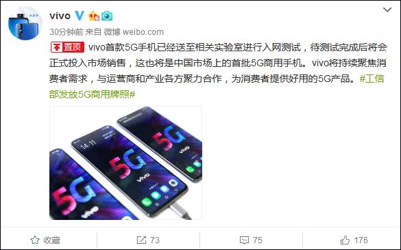 vivo在官方微博表示,vivo首款5G手機已經送至相關實驗室進行入網測試,待測試完成后將會正式投入市場銷售,這也將是中國市場上的首批5G商用手機。
