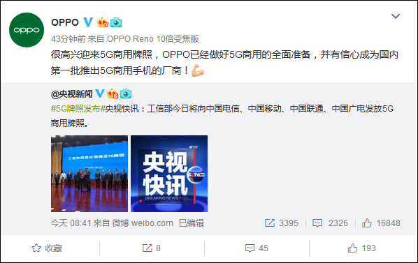 OPPO則表示,很高興迎來5G商用牌照,OPPO已經做好5G商用的全面準備,并有信心成為國內第一批推出5G商用手機的廠商!