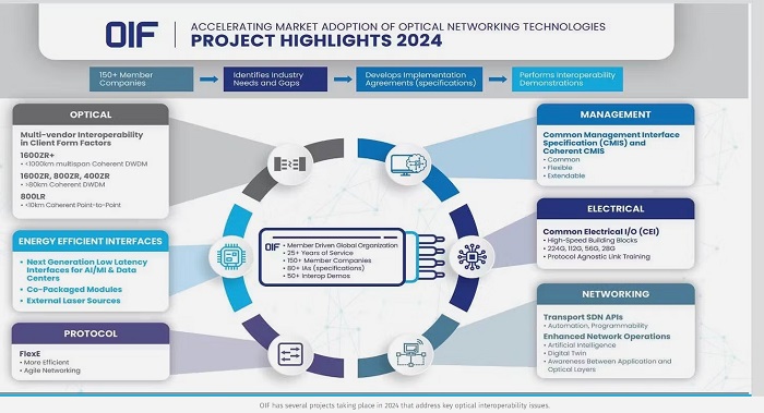 OIF在德國(guó)法蘭克福舉行的2024年ECOC展覽上領(lǐng)導(dǎo)了一場(chǎng)互操作性演示,展示了34家成員公司之間的實(shí)時(shí)協(xié)作。此次活動(dòng)展示了性能、效率和容量方面的進(jìn)步,以響應(yīng)面向未來(lái)的數(shù)據(jù)中心、AI/ML技術(shù)以及解耦系統(tǒng)的需要。
