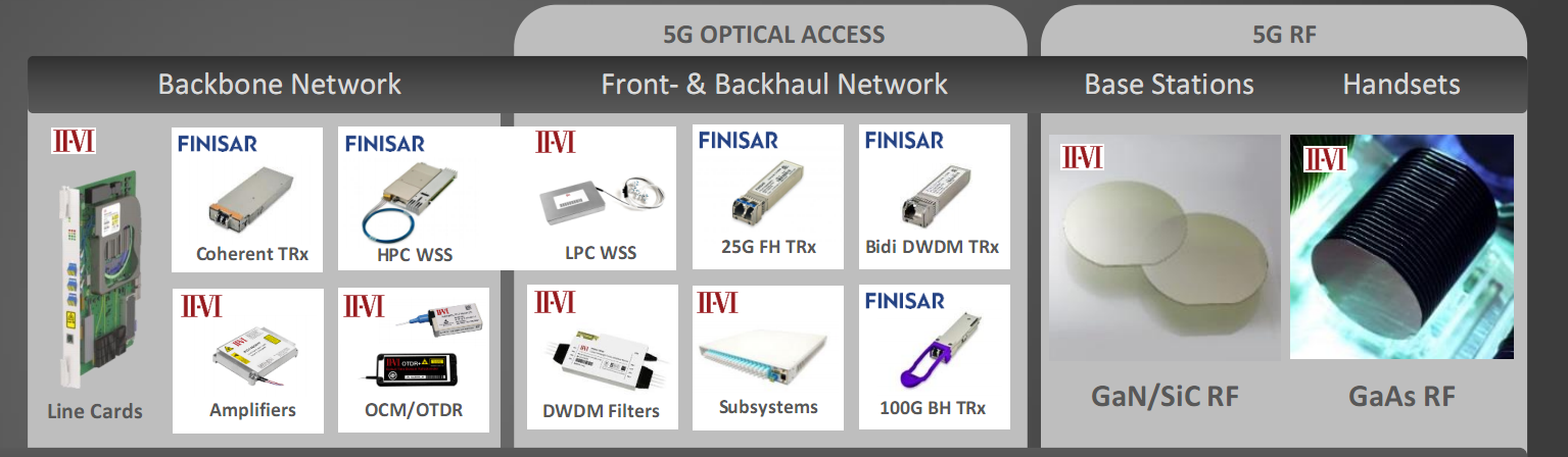 5G移動(dòng)基礎(chǔ)設(shè)施講師未來增長的新機(jī)遇,II-VI與Finisar基于各自的技術(shù)平臺(tái)以及產(chǎn)品互補(bǔ),使II-VI在5G光接入、5G射頻以及系統(tǒng)模塊方面成為全面的光電子器件供應(yīng)商。