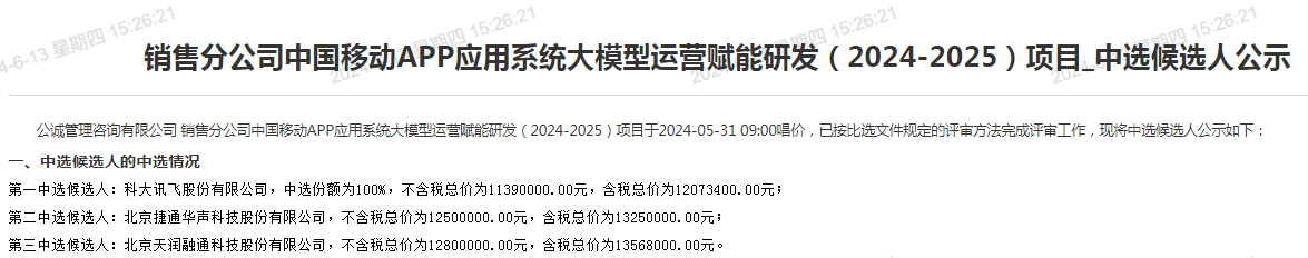 ICC訊 近日,中國移動(dòng)通信有限公司銷售分公司中國移動(dòng)APP應(yīng)用系統(tǒng)大模型運(yùn)營賦能研發(fā)(2024-2025)項(xiàng)目和國元證券股份有限公司發(fā)布的《大模型基礎(chǔ)設(shè)施及投行大模型研究課題》招標(biāo)項(xiàng)目相繼揭曉中標(biāo)結(jié)果,科大訊飛及其全資子公司分別成為兩大項(xiàng)目的中標(biāo)企業(yè),讓科大訊飛六月份的業(yè)績迎來開門紅。