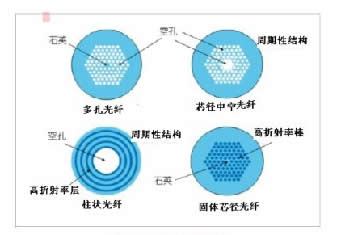 光子晶體光纖,具有在石英玻璃中(包層)有空孔的配列構(gòu)造。隨著PCF的空孔陣列結(jié)構(gòu)和空孔尺寸大小的變化,將呈現(xiàn)出與通常光纖不同的特點,即表現(xiàn)在高非線性、色散可控性、極化波保持和單模工作等各方面上。如果將PCF光纖光波傳輸原理進行分類,可以分為折射率波導(dǎo)型PCF光纖和光子帶隙光纖兩種。