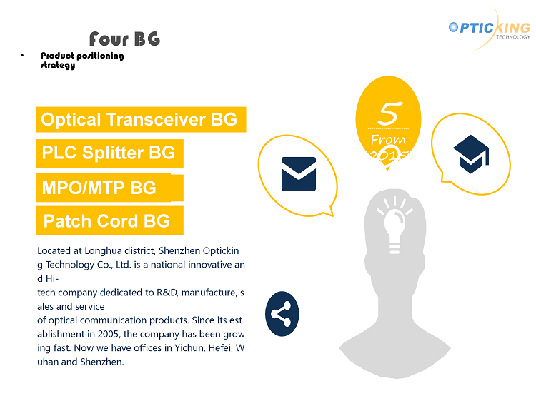 深圳市歐博凱科技有限公司(簡稱歐博凱)是位于深圳市龍華區(qū)的一家國家級創(chuàng)新型高新技術(shù)企業(yè),是集光通信產(chǎn)品研發(fā)、制造、銷售和服務(wù)為一體的供應(yīng)商,歐博凱自2005年成立至今,企業(yè)高速發(fā)展,在江西宜春、安徽合肥、武漢、深圳設(shè)有分公司。