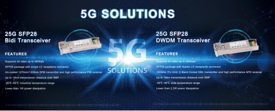 5G解決方案:25G SFP28 DR/LR/ER、25G SFP28 CWDM/DWDM以及25G SFP28 BIDI LR等產(chǎn)品。優(yōu)博創(chuàng)此次重點推出的25G SFP28 Bidi光模塊,該產(chǎn)品滿足工業(yè)級溫度,傳輸距離可達10km,功耗小于1W。并且沿用10G Bidi 1270/1330nm波長,通過不同的收發(fā)波長在同一根光纖傳輸,達到節(jié)約光纜資源目的。提供了從10G平滑升級到25G低功耗、低延遲解決方案。