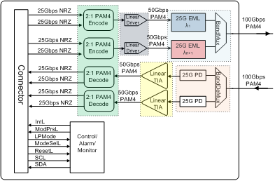 光迅科技推出的100G 雙載波DWDM QSFP28產(chǎn)品,使用非相鄰雙載波光收發(fā)器,其光收發(fā)器采用自制的DWDM EML激光器和自制的PIN/APD探測器,并結(jié)合自制的循環(huán)陣列波導(dǎo)光柵(AWG)復(fù)用器,能夠?qū)崿F(xiàn)通道間隔50GHz DWDM傳輸,支持商業(yè)溫度(0~70℃)的工作范圍,典型功耗為5W,性能達到業(yè)內(nèi)領(lǐng)先水平,并且結(jié)合光迅科技的光放大器、自適應(yīng)色散補償模塊能夠?qū)崿F(xiàn)大于100km的點對點傳輸。