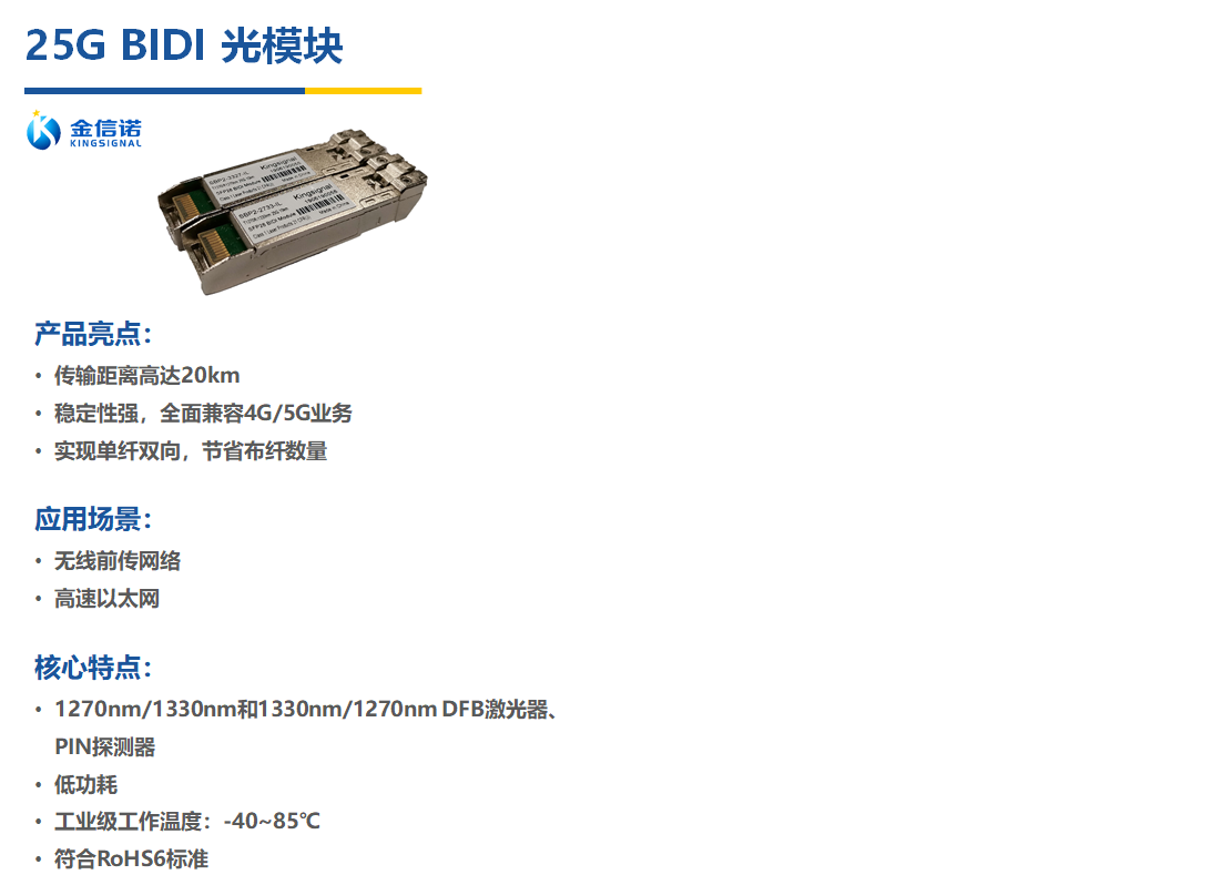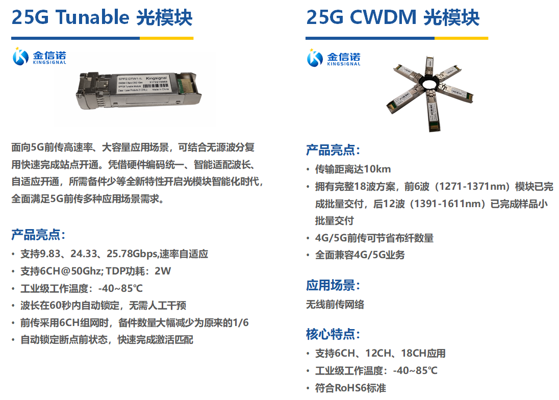 金信諾具備光器件、光模塊的規(guī)劃、研發(fā)、測試、生產(chǎn)、物流、銷售的端到端交付能力,針對4G無線基站配套使用的10G、6G工業(yè)級光模塊以及數(shù)據(jù)中心使用的25G、40G、100G 多模模塊、AOC已批量供貨;在面向5G網(wǎng)絡(luò)的100G、25G光模塊上重點投入,已實現(xiàn)小批量發(fā)貨。產(chǎn)品規(guī)劃與樣品交付能力位居行業(yè)一流梯隊,其中工業(yè)級100G、25G光模塊已進入行業(yè)主流設(shè)備商的小批量測試階段。