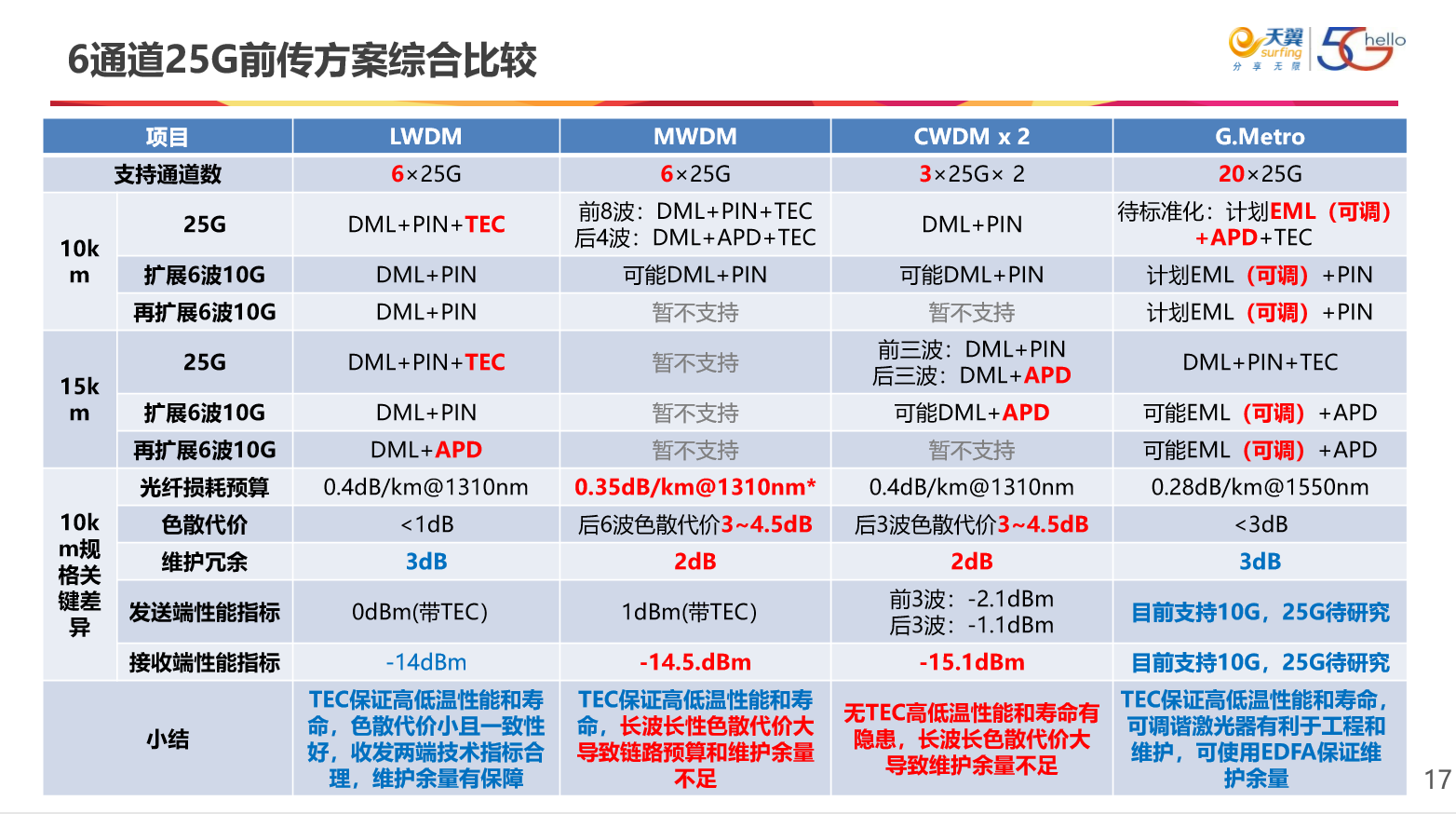 在5G對光模塊的需求,前傳方面涉及到多種技術。唐博士認為,當前DRAN場景下BiDi是很明確的,而CRAN的場景下,以CWDM為主,將來有可能為LWDM或CWDM,主要看產(chǎn)業(yè)的發(fā)展與成本?;貍鞣矫?,主要第一級回傳或接入層主要為25G、50G,匯聚及往上可能采用100G,主要采用低成本相干技術,要求 80km及以上,將來可能采用400G。