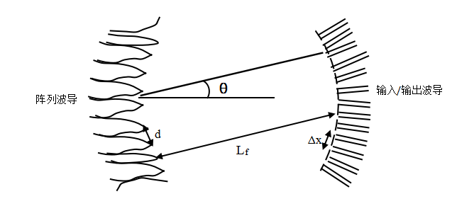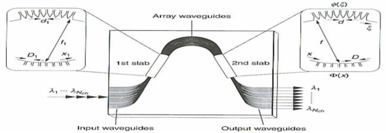 陣列波導(dǎo)光柵(AWG)一般由N個(gè)輸入波導(dǎo)、N個(gè)輸出波導(dǎo)、2個(gè)N*M平板波導(dǎo)星形耦合器以及一個(gè)M個(gè)波導(dǎo)平板陣列波導(dǎo)光柵組成,這里M可以等于N,也可以不等于N。這種光柵相鄰波導(dǎo)間具有恒定的路徑長(zhǎng)度差。