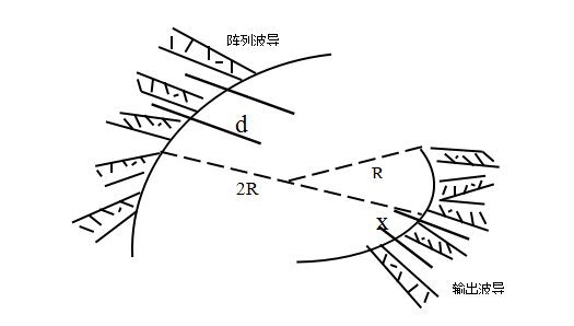如圖4, 輸入、輸出波導(dǎo)的端口位于半徑為R 的Rowland 圓周上(波導(dǎo)間距為x), 且對(duì)稱(chēng)地分布在焦距為f=2R 的平板波導(dǎo)的輸入端, 陣列波導(dǎo)的端口(間距為d)分布在半徑為2R 的光柵圓周上(圓心在中心輸入/輸出波導(dǎo)端部), 且陣列波導(dǎo)的中心位于光柵圓與Rowland 圓的切點(diǎn), 相鄰波導(dǎo)的光程差ΔL 等于AWG中心波長(zhǎng)的整數(shù)倍。