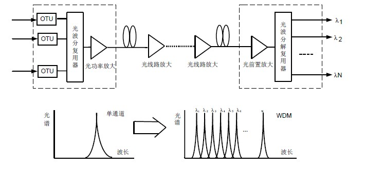 為了能夠合理的利用單模光纖在 1.55pm 低損耗區(qū)產(chǎn)生的寬帶資源 ,就需要根據(jù)不同的頻率以及波長(zhǎng)將光纖的低損耗區(qū)劃分成多個(gè)光波道 ,而且需要在每個(gè)光波道建立載波即我們所說(shuō)的光波 ,同時(shí)利用分波器在發(fā)送端合并各種不同規(guī)定波長(zhǎng)的信號(hào) ,將這些合并起來(lái)的信號(hào)集體傳入一個(gè)光纖中, 進(jìn)行信號(hào)傳輸。傳輸?shù)浇邮斩藭r(shí),在利用一個(gè)光解復(fù)用器將這些合并到一起的具有不同波長(zhǎng)。不同光波的信號(hào)分解開(kāi)分成最初的狀態(tài)實(shí)現(xiàn)了在一根光纖中可以傳輸多種不同信號(hào)的功能。
