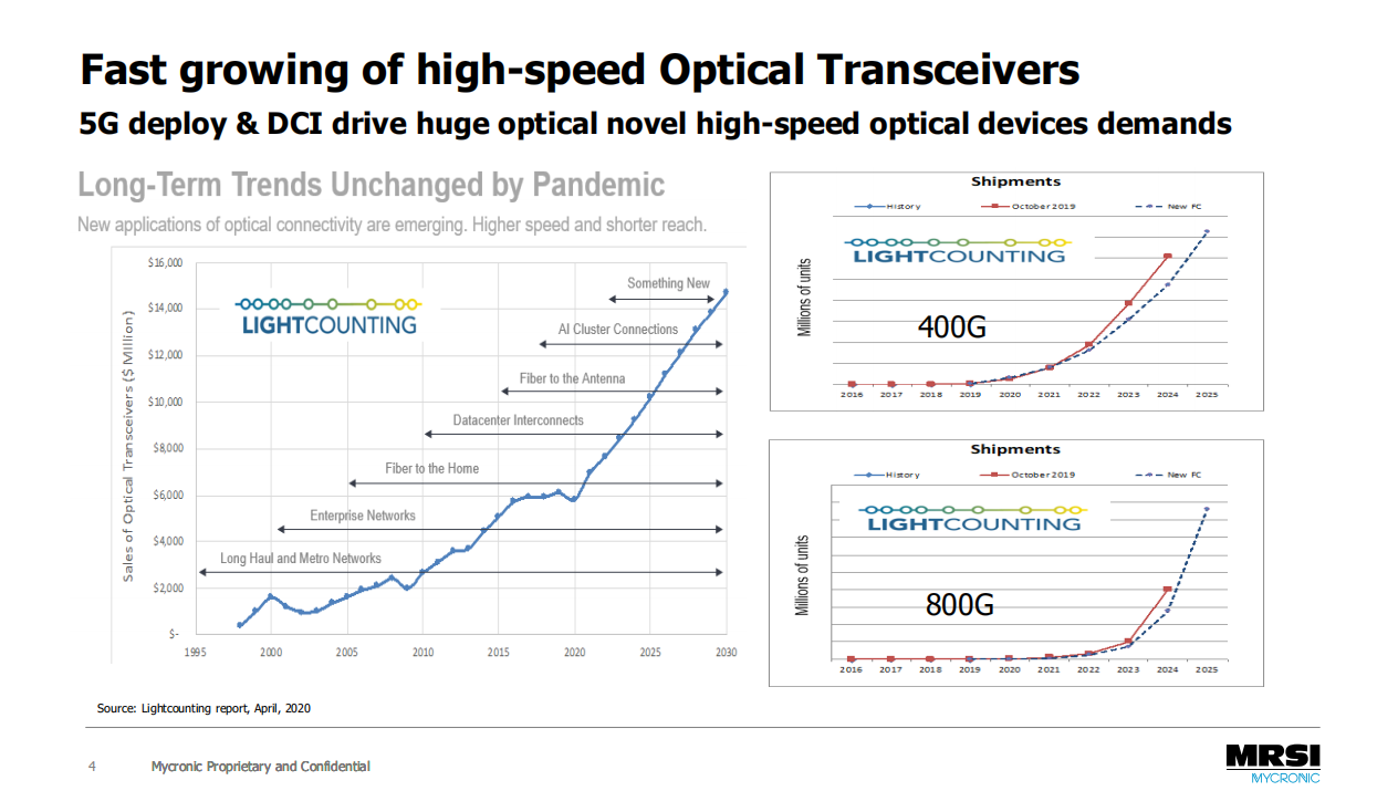 5G時(shí)代新型器件由于成本的壓力,新型的低成本封裝形式興起。例如TO封裝,復(fù)雜的TO集成了不同的光電器件,需要多芯片多工藝的復(fù)雜封裝。射頻放大的器件的需求量更大,并采用新型的材料和工藝。光子集成希望可以做到光模塊低成本,從芯片到wafer的封裝低成本是必須的。2018年,錢博士在Laser Focus World發(fā)表文章表示,云時(shí)代產(chǎn)品的更新迭代更加快,光器件以每年25%的需求量在遞增,同樣光器件的功能成本以每年大于10%的速度遞減。這個(gè)趨勢(shì)仍在持續(xù)并將持續(xù)很長(zhǎng)一段時(shí)間。作為貼片方案提供商,MRSI面對(duì)新型器件的生產(chǎn)需求始終致力于開(kāi)發(fā)最佳的創(chuàng)新解決方案。