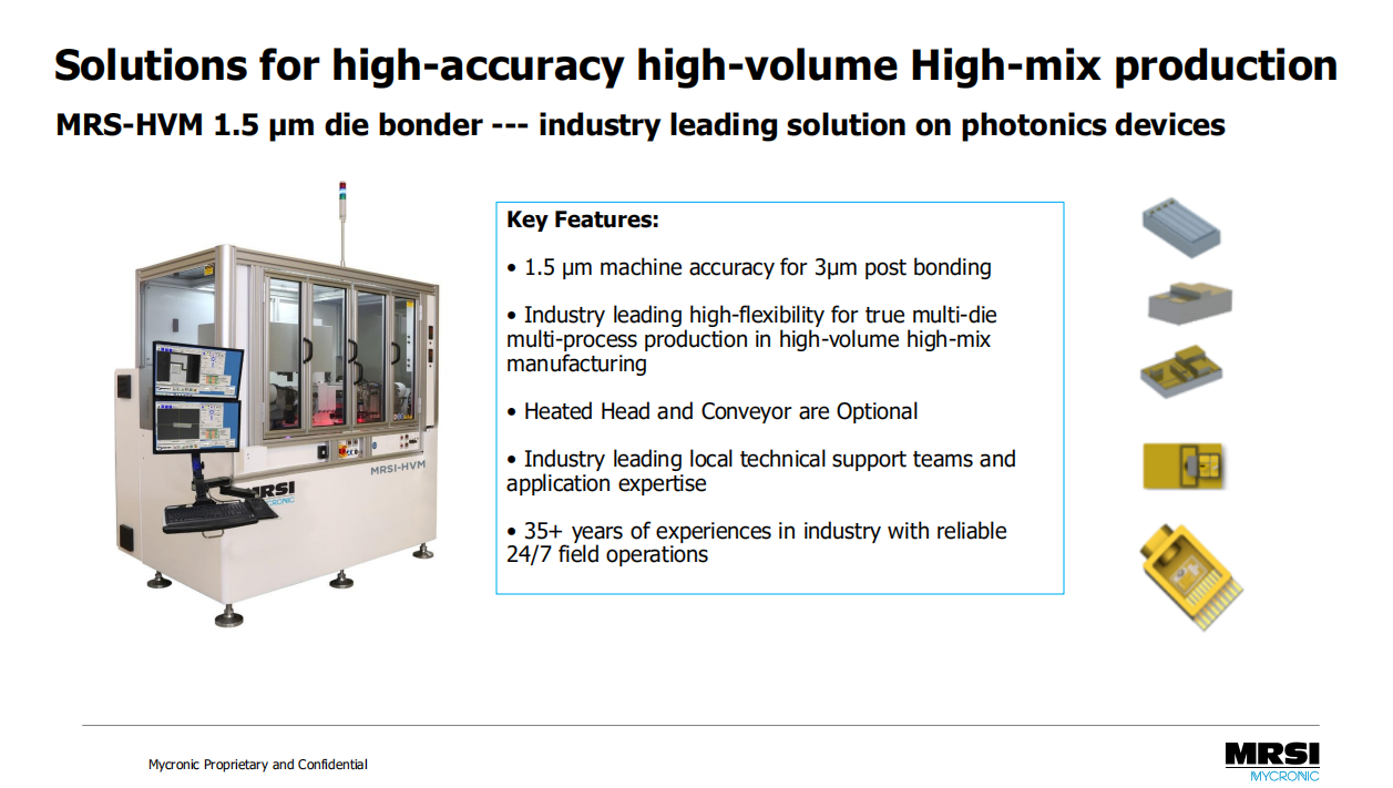 面對(duì)新型器件封裝的挑戰(zhàn),MRSI不斷推陳出新,2020年9月8號(hào)正式發(fā)布了新產(chǎn)品MRSI-S-HVM光子集成的解決方案。MRSI針對(duì)目前光器件的挑戰(zhàn),提供穩(wěn)定性和可靠性高的貼片設(shè)備,提升精度,同時(shí)保證業(yè)內(nèi)最高的生產(chǎn)速度。針對(duì)不同的應(yīng)用提供多工藝的靈活性。這樣將給客戶帶來(lái)最高的投資回報(bào)率。