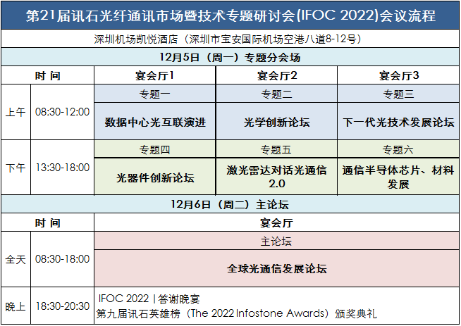 2022年12月5-6日,第21屆訊石光纖通訊市場(chǎng)暨技術(shù)專題研討會(huì)(The 21st Infostone Optical Communication Market and Technology Conference,簡(jiǎn)稱“IFOC”、“訊石研討會(huì)”)邀您共聚深圳機(jī)場(chǎng)凱悅酒店(地址:深圳市寶安國(guó)際機(jī)場(chǎng)空港八道8-12號(hào)),從七大專題深入探討覆蓋整個(gè)光通訊市場(chǎng)的全面內(nèi)容,層層遞進(jìn)式分析技術(shù)發(fā)展趨勢(shì),深度融入熱點(diǎn)話題為行業(yè)發(fā)展注入新鮮力量。
