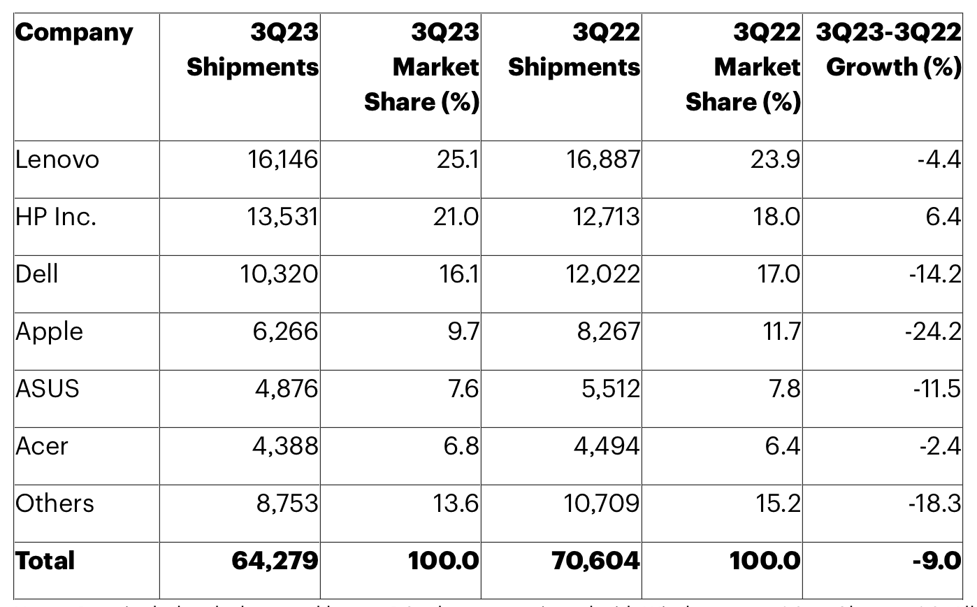 ICC訊 市場研究機構(gòu)Gartner發(fā)布數(shù)據(jù)顯示,2023年第三季度,全球PC出貨量6428萬臺,同比下降9%,是連續(xù)第八個季度下降。不過相比第一季度的30%、第二季度的16.6%下降,第三季度的降幅持續(xù)縮窄。