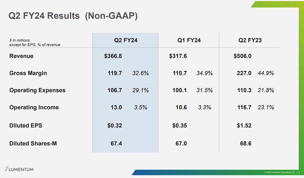 2023年11月7日,Lumentum完成了對云暉公司(Cloud Light Technology Limited)的收購。因此第三季度營收將包括來自云暉的完整季度貢獻。