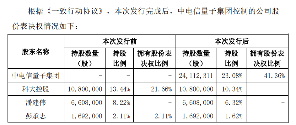 根據(jù)中電信量子集團(tuán)與公司簽訂的《附條件生效的股份認(rèn)購(gòu)協(xié)議》,本次發(fā)行完成后,中電信量子集團(tuán)將直接持有公司 24,112,311 股,持股比例為 23.08%。同時(shí),中電信量子集團(tuán)通過與科大控股、彭承志簽訂《一致行動(dòng)協(xié)議》,合計(jì)控制公司 41.36%的股份表決權(quán)。本次發(fā)行完成后,中電信量子集團(tuán)成為公司控股股東,國(guó)務(wù)院國(guó)資委成為公司實(shí)際控制人,不會(huì)導(dǎo)致公司股權(quán)分布不具備上市條件。