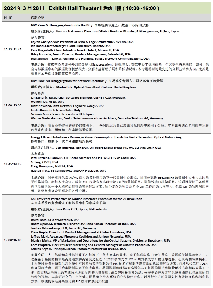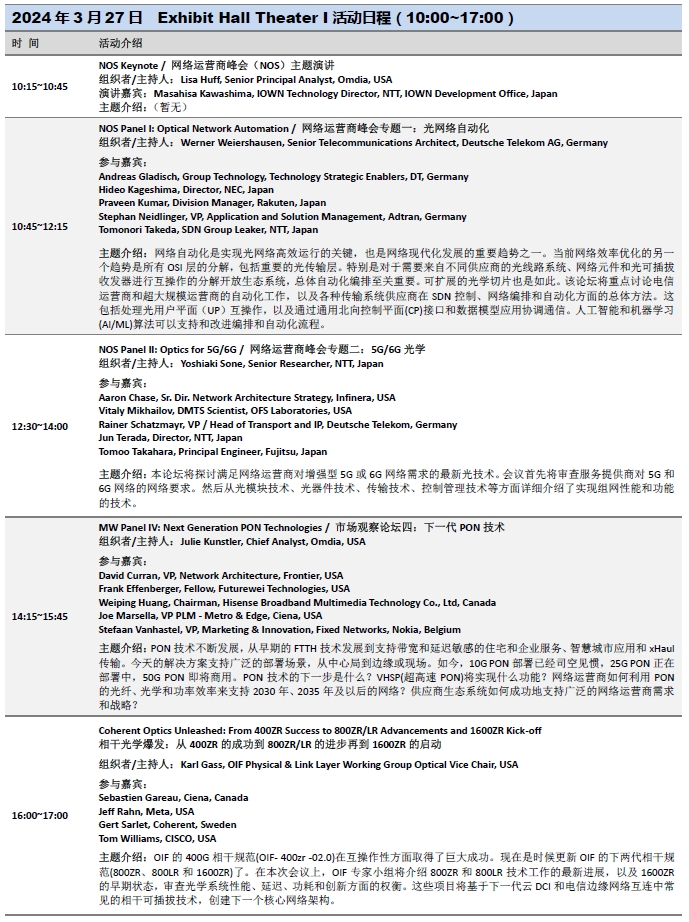OFC在展場(chǎng)設(shè)置了三個(gè)會(huì)場(chǎng):Exhibit Hall Theater I、Exhibit Hall Theater II、Exhibit Hall Theater III,每個(gè)會(huì)場(chǎng)都有為期三天(3.26-3.28)的會(huì)議活動(dòng)。以下是Exhibit Hall Theater I(一號(hào)廳)三天的活動(dòng)安排日程。