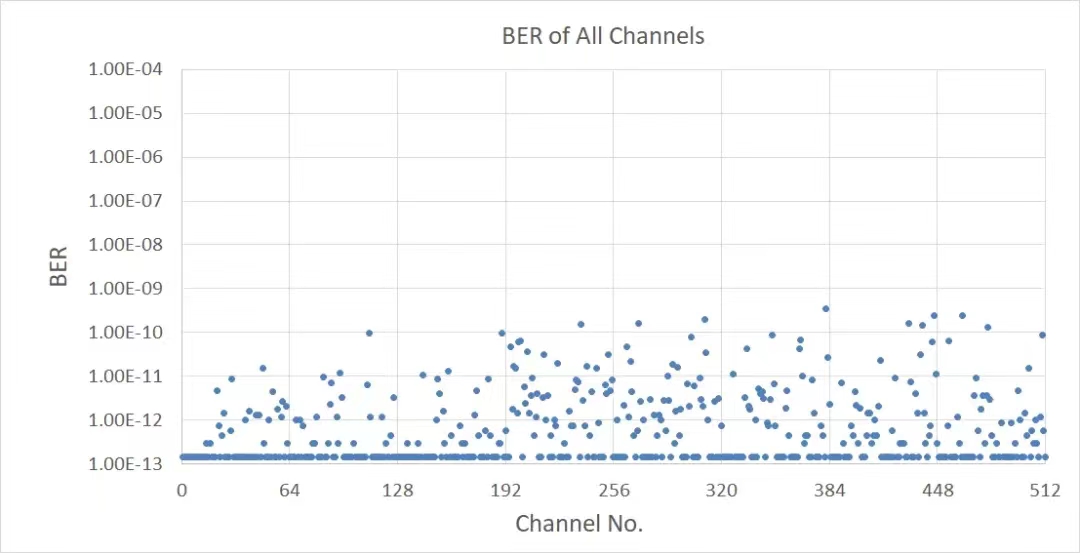 交換機所有端口插上LPO后,進行光口自環(huán)誤碼率測試。通過交換機命令展示可以看到所有使用的800G LPO光模塊端口誤碼率(BER)在展會現(xiàn)場常溫25度環(huán)境下均小于1e-11,表現(xiàn)十分優(yōu)異。在實驗室高溫50度環(huán)境下也均小于1e-9,仍有5個數(shù)量級的裕量,完全滿足數(shù)據(jù)中心場景使用。