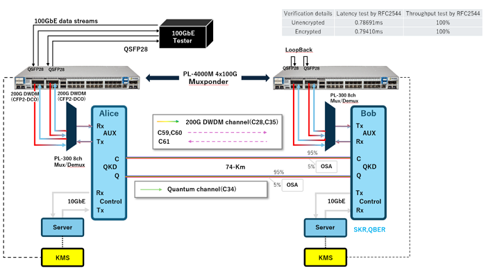 東芝在沖繩的長途QKD系統(tǒng)使用PacketLight的PL-4000M Muxponder在74公里的鏈路上傳輸兩個200G波長,量子信道運(yùn)行在1550nm上。使用100G測試儀測量鏈路性能,顯示z出100%吞吐量和低延遲,符合RFC2544標(biāo)準(zhǔn)。