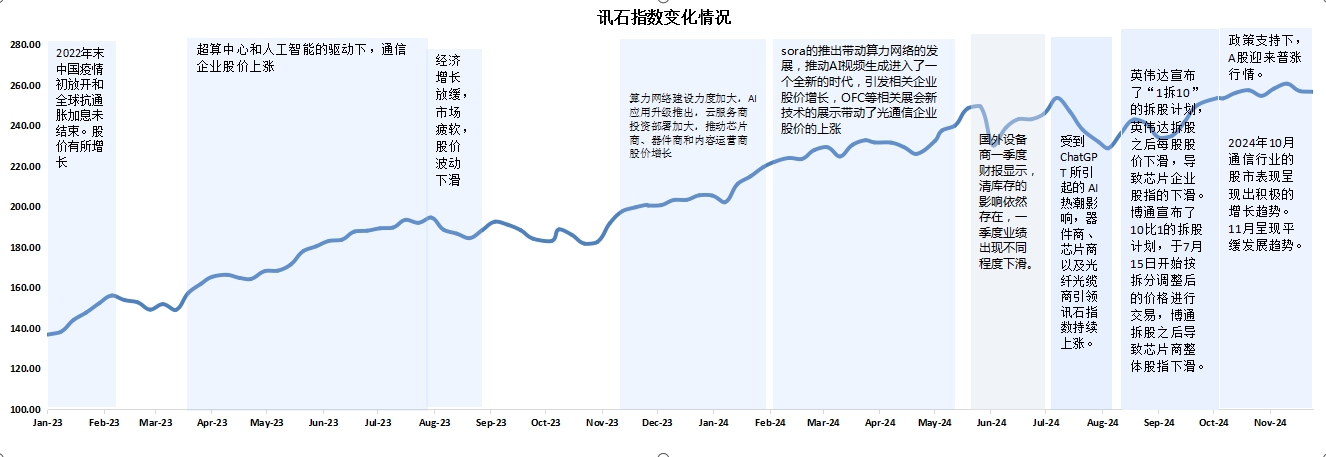 ICC訊 2024年11月通信行業(yè)的股市表現(xiàn)呈現(xiàn)平緩趨勢。截止到11月29日,訊石統(tǒng)計的指數(shù)值為256.73,比上月的257.49下滑0.76,11月市場整體呈現(xiàn)平緩趨勢,略微下滑。11月美國大選落定,美國主要股指創(chuàng)下新高,主要科技股都在大漲。運營商發(fā)力智算,云廠商加大算力投入,算力賽道蓬勃發(fā)展,整體通信信業(yè)平穩(wěn)運行。盡管整體股市表現(xiàn)平緩,但通信行業(yè)的細分領域卻呈現(xiàn)出不同發(fā)展趨勢。
